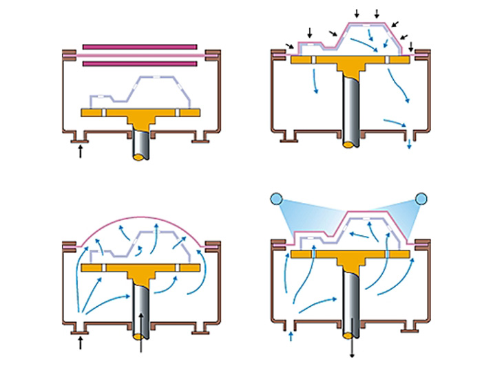 Il materiale plastico preriscaldato si adagia sullo stampo per aspirazione (sottovuoto), riproducendo la sagoma e i particolari dello stampo stesso.